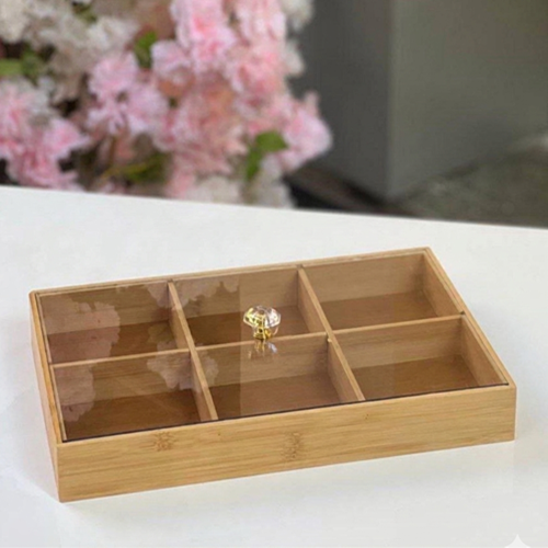 جبنالك بوكس تسالي 6 خانات 🍪🌰🍬دلوقتي قدمي التسالي بشكل شيك ومنظم مع طبق التسالي المستطيل 6 خانات 💛✨تصميم عملي وجميل يخلي الضيافة شكلها أفخم بكتير 👌