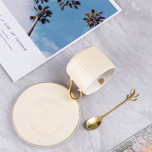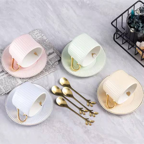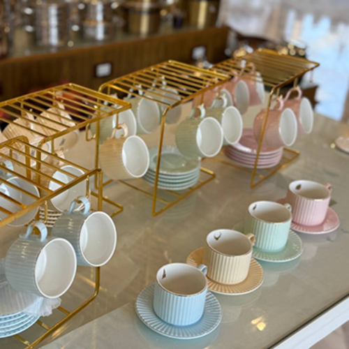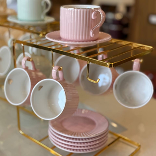 الطقم مكوّن من ٦ فناجين + ٦ أطباق + حامل جولد فخم جدًا