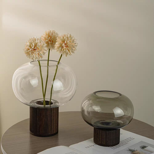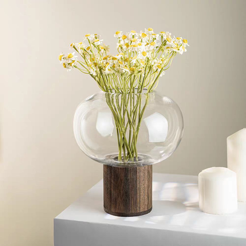 فازة زجاج بتصميم راقي جدًا ولمسة خشب أنيقة تضيف جو من الشياكة لأي ركن في البيت ✨
