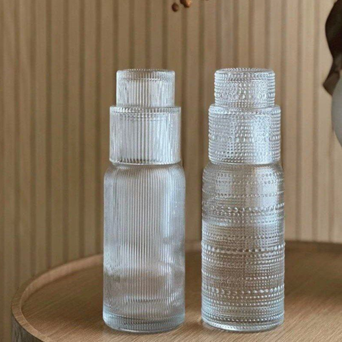 زجاجة كريستال شفافة بلمسات بارزة مميزة، ومعاها الكوب اللي بيركب فوقها بشكل عملي وأنيق 👌