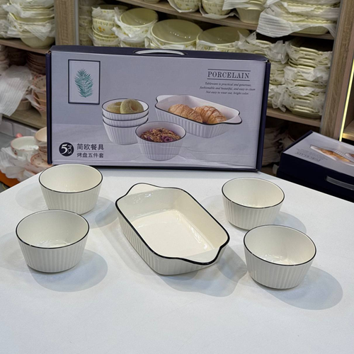 جبنالك طقم بورسلين 5 قطع 🤍لو بتحبي السفرة المرتبة والشيك من غير تكلف… الطقم ده هيعجبك جدًا 👌🏻