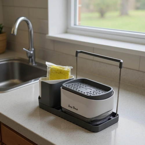 لو بتدوري على منتج عملي وشيك للمطبخ، موزع صابون مع حامل أسفنجة ده هيبقى الحل الأمثل 💦